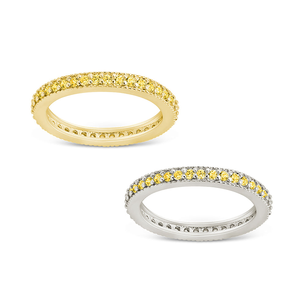 A pop of sunshine, redefined. This band features canary yellow cubic zirconia in a sleek pavé setting. Wear solo or stacked—it’s joy in jewelry form.