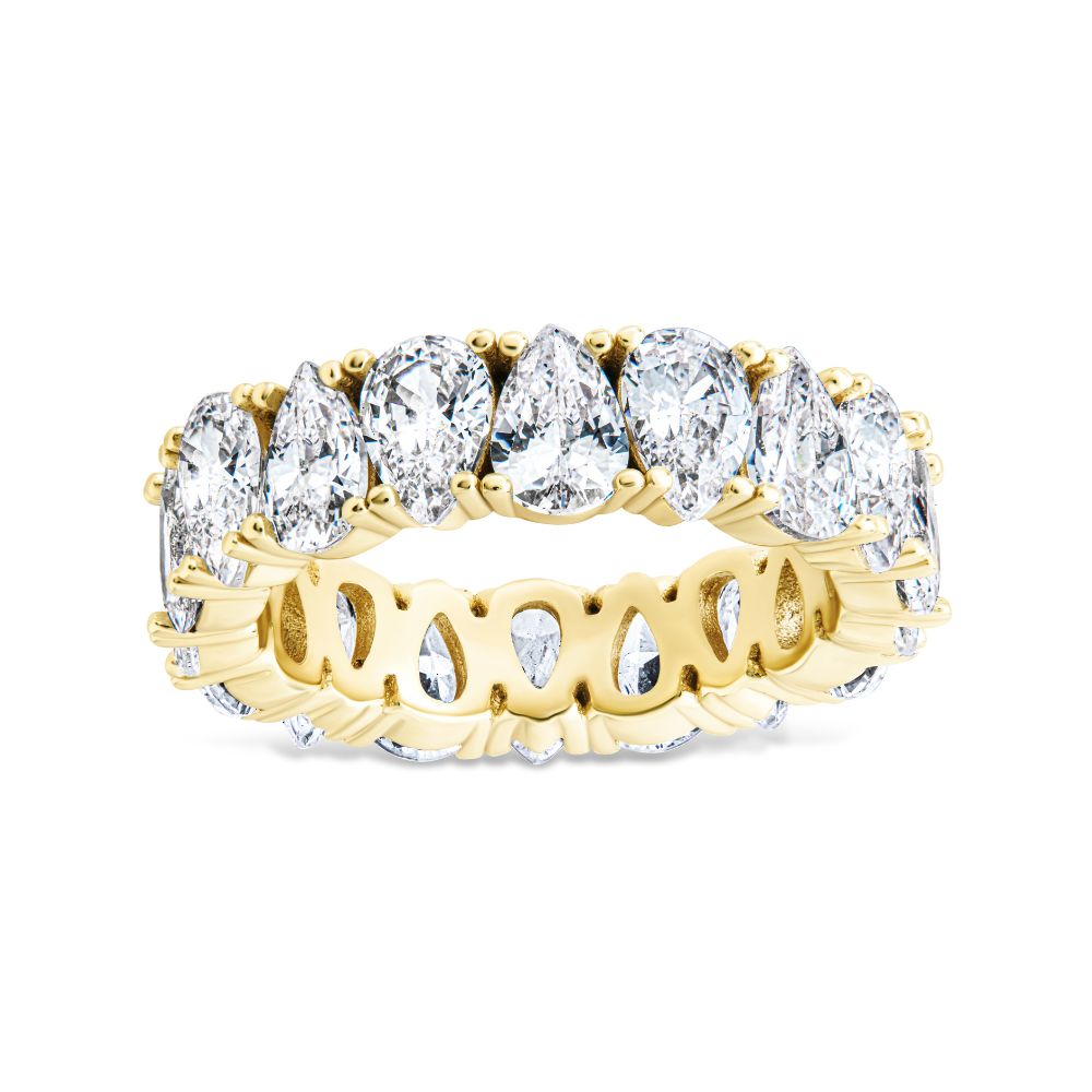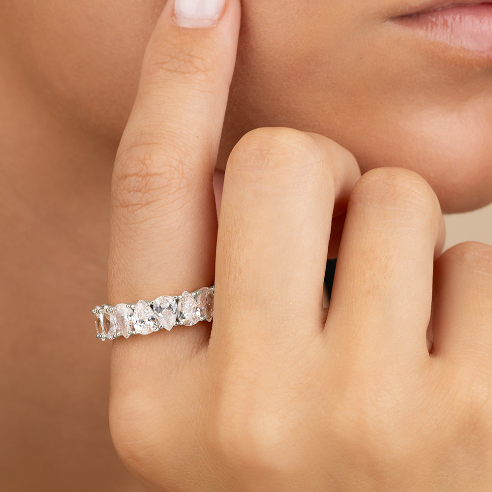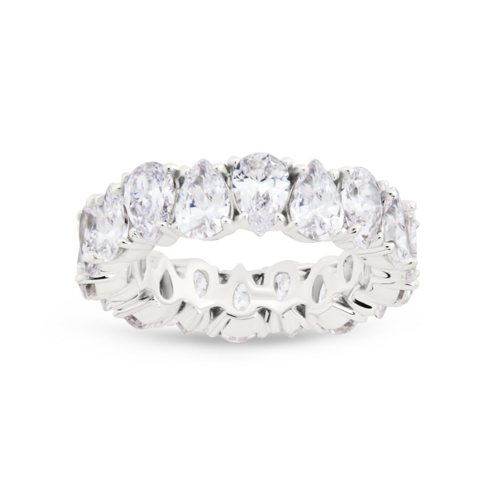 A bold yet timeless take on eternity bands. This striking ring features a row of pear-shaped CZs, creating a dazzling, high-shine effect. Whether worn solo or stacked, it’s a statement piece made to shine.
