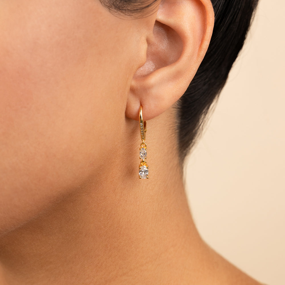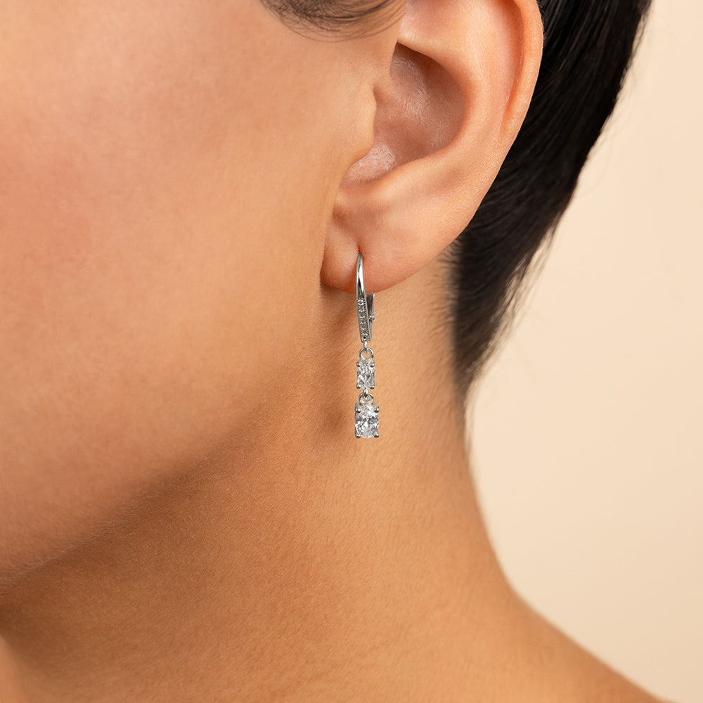 This duo keeps things simple: a stacked pair of oval-cut Hearts & Arrows CZs, set in sterling silver with a smooth French clip closure. Light on the ear, strong on detail.