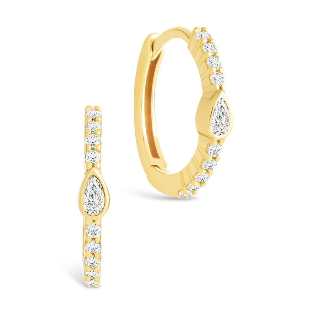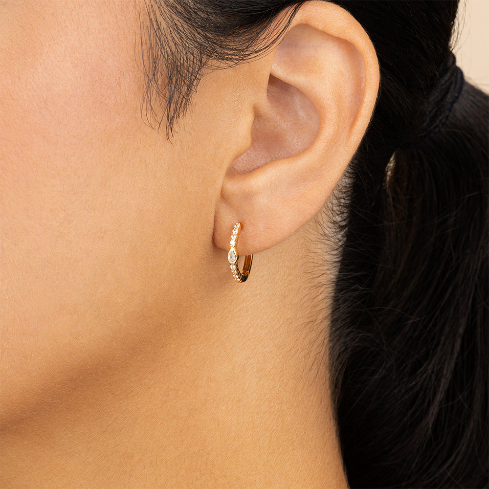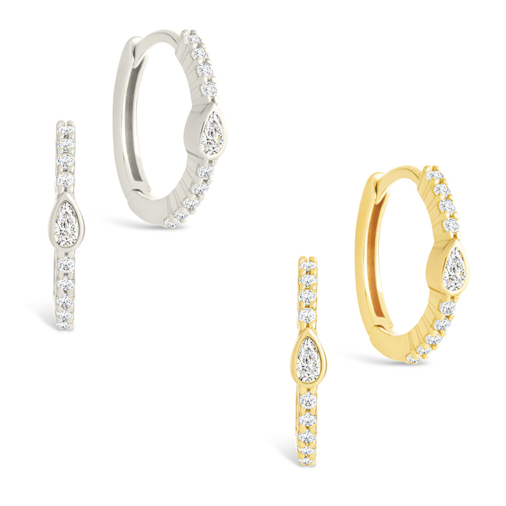 A refined twist on the classic huggie. These hoops feature a pear-shaped CZ bezel that catches the light just right—framed by a stream of round stones for extra shimmer. Stack with other silhouettes or wear solo for soft-glam impact.