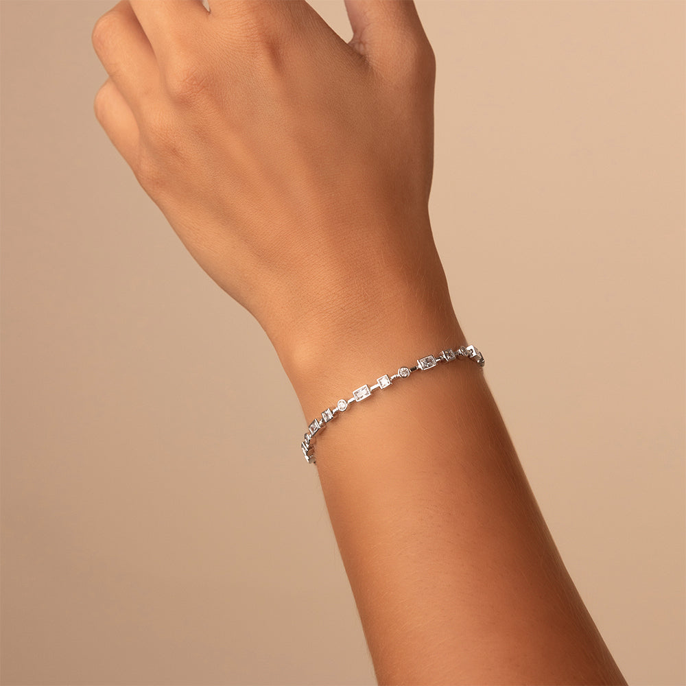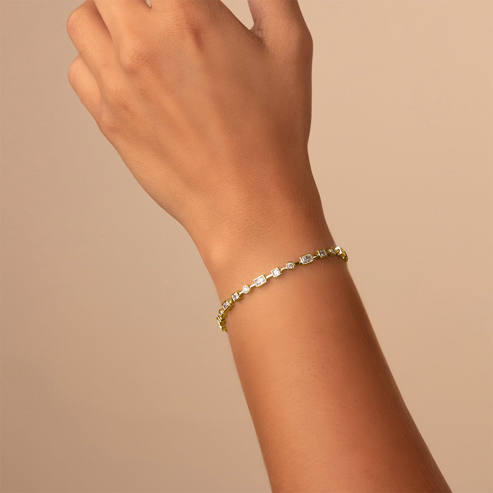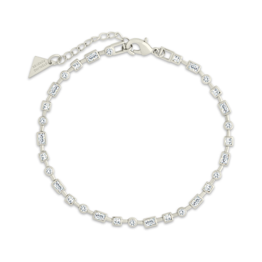The Camden CZ Staggered Tennis Necklace isn’t your average tennis chain. With a mix of round, square, and baguette-cut Hearts & Arrows CZ stones in sleek bezel settings, it’s the perfect balance of classic and unexpected.
