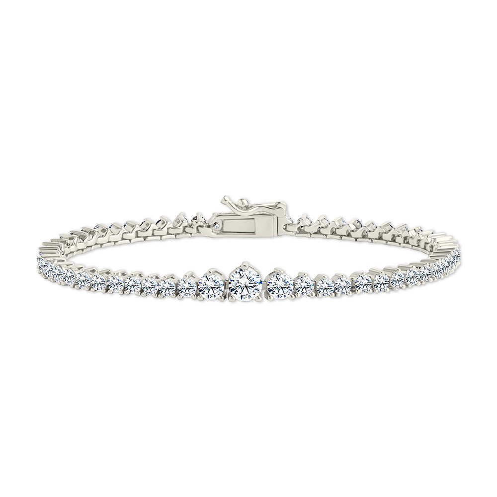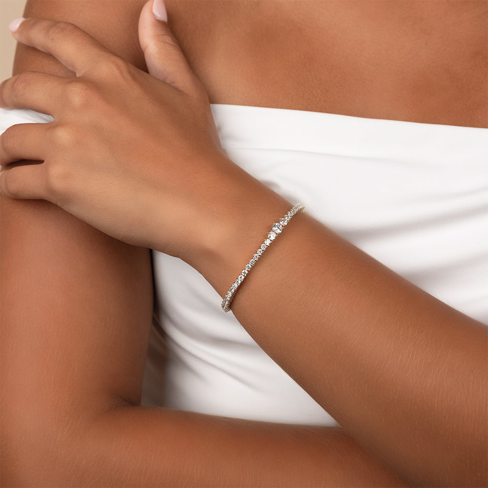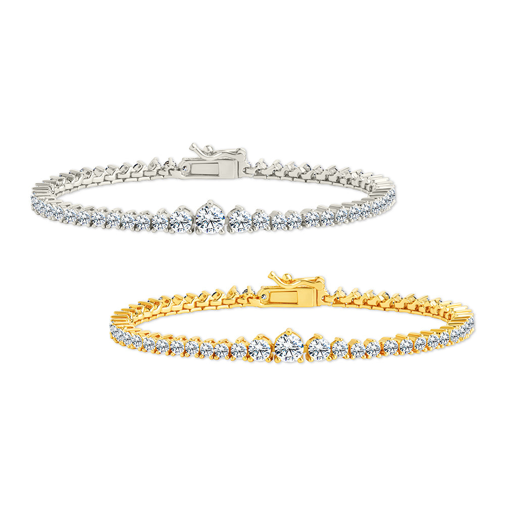 The Tatum CZ Tennis Bracelet is a twist on the classic. With Hearts & Arrows CZs and graduated round stones that get bigger in the center, it’s bold but still effortless.